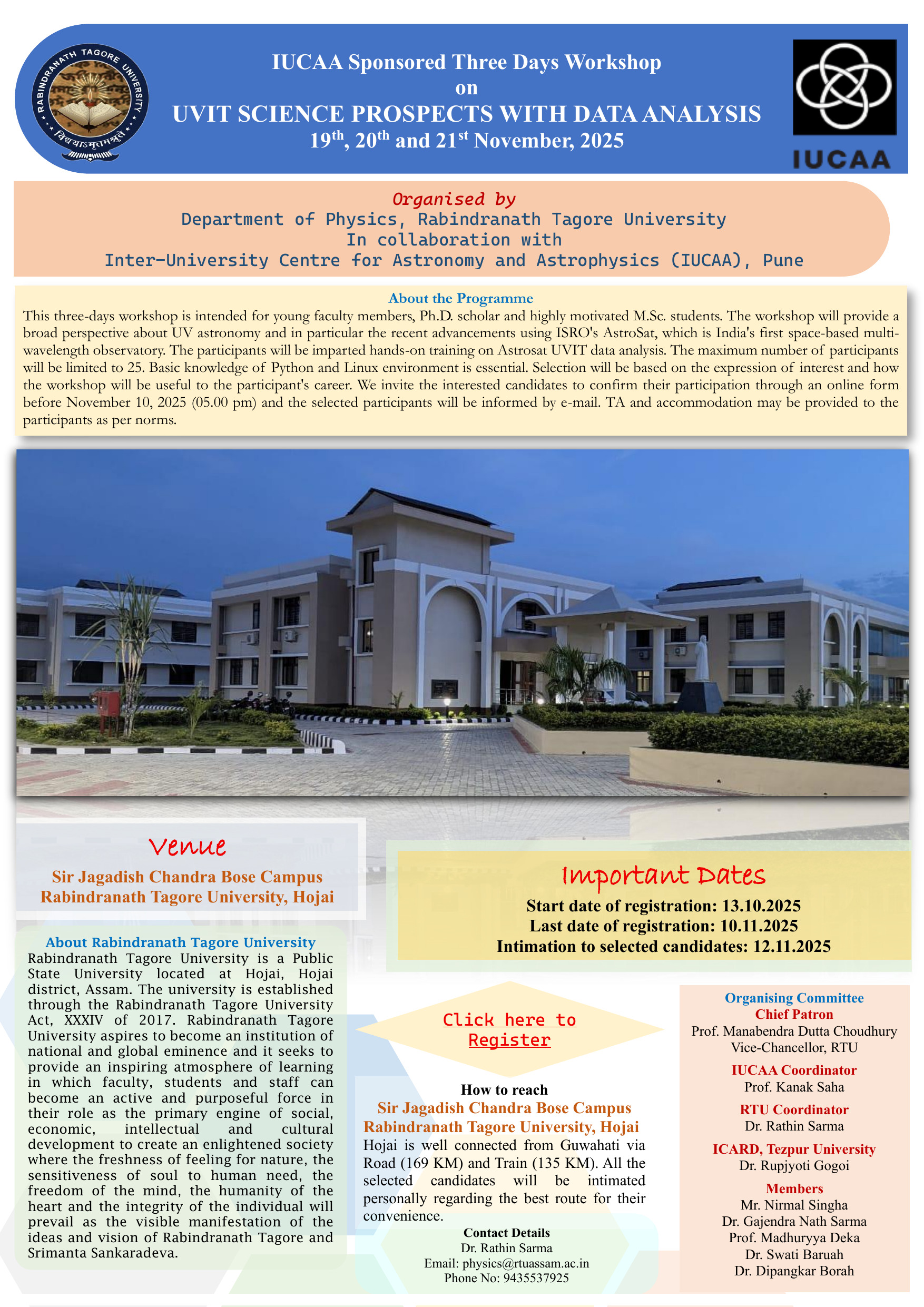 Rabindranath Tagore University is a Public State University located at Hojai, Hojai district, Assam. The university is established through the Rabindranath Tagore University Act, XXXIV of 2017 which was passed by the State Legislature of Assam in 2017. The Act was approved by the then Governor of Assam on 16 October 2017...Read More
